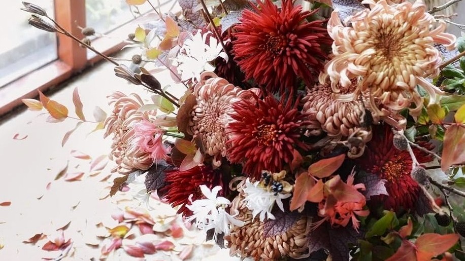 秋が旬の大輪マム(洋菊)を使った花束レッスンを行います。